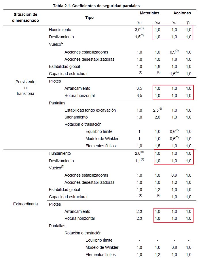 Este método global es el usado actualmente por las comprobaciones exigidas por normativa tanto en CTE DB SE-C «Cimientos» como en la «Guía de Cimentaciones en obras de carretera» del Ministerio de Fomento. Esto es cierto a pesar de que el texto del documento básico (DB SE-C) lo camufla con un supuesto método de coeficientes parciales, pero al prestar algo de atención vemos en la Tabla 2.1 que los coeficientes asignados a la mayoración de las acciones son todos unitarios en los casos afectados por el terreno, por lo que en realidad es un método de coeficiente único.