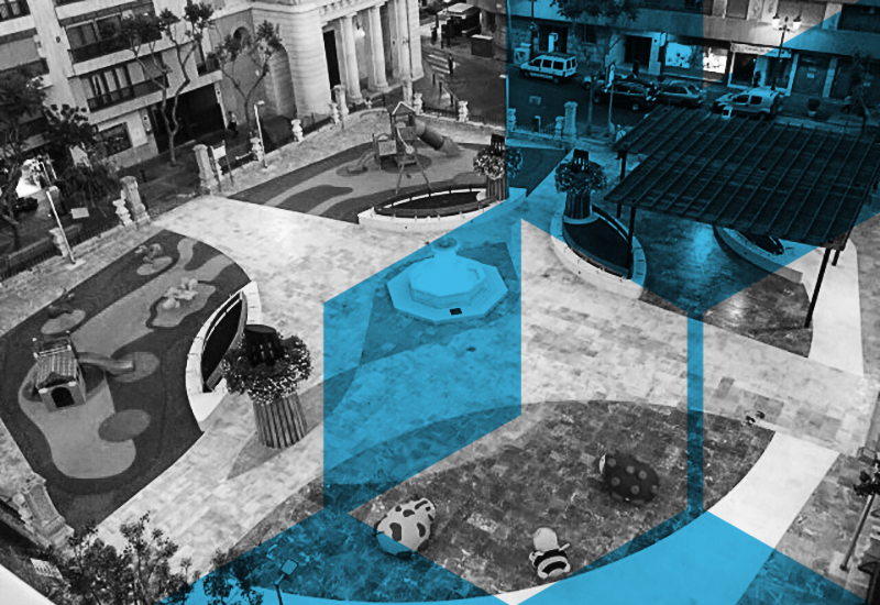 Se añaden zonas de juegos y equipamientos infantiles, cuyos pavimentos elásticos subyacentes de colores vivos se integran en las siluetas ovaladas del perímetro, completando la composición de alto dinamismo de la plaza.