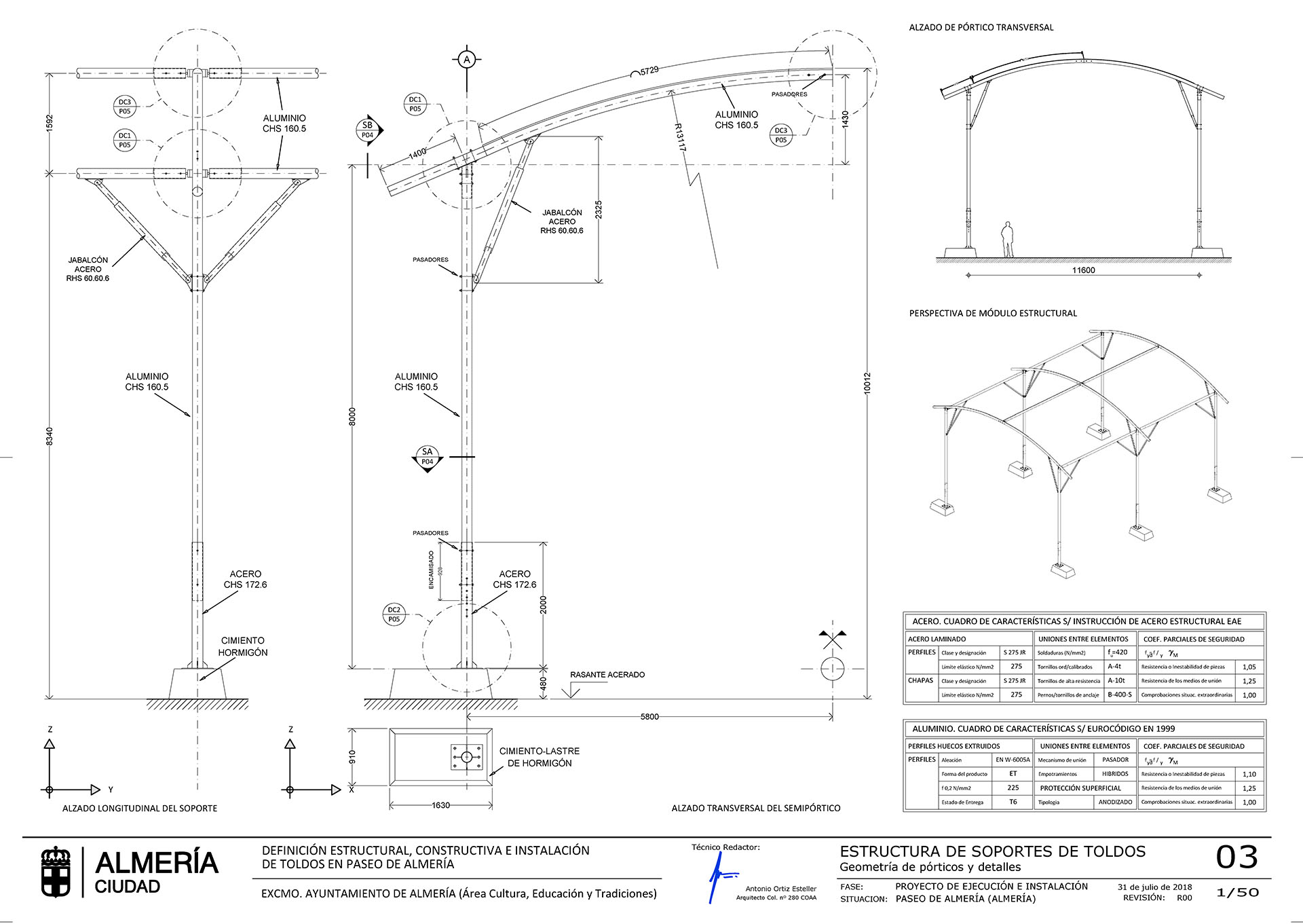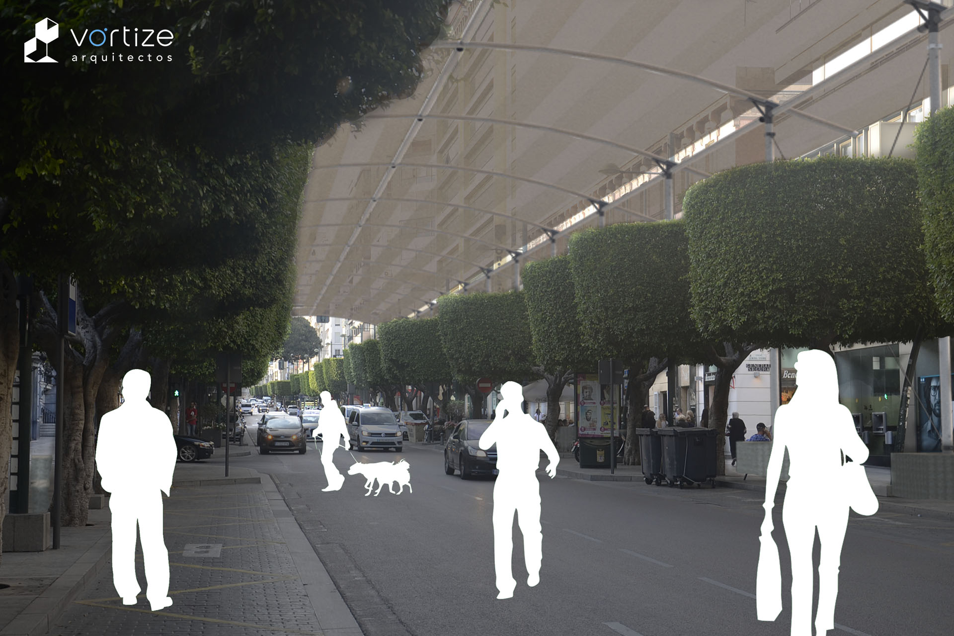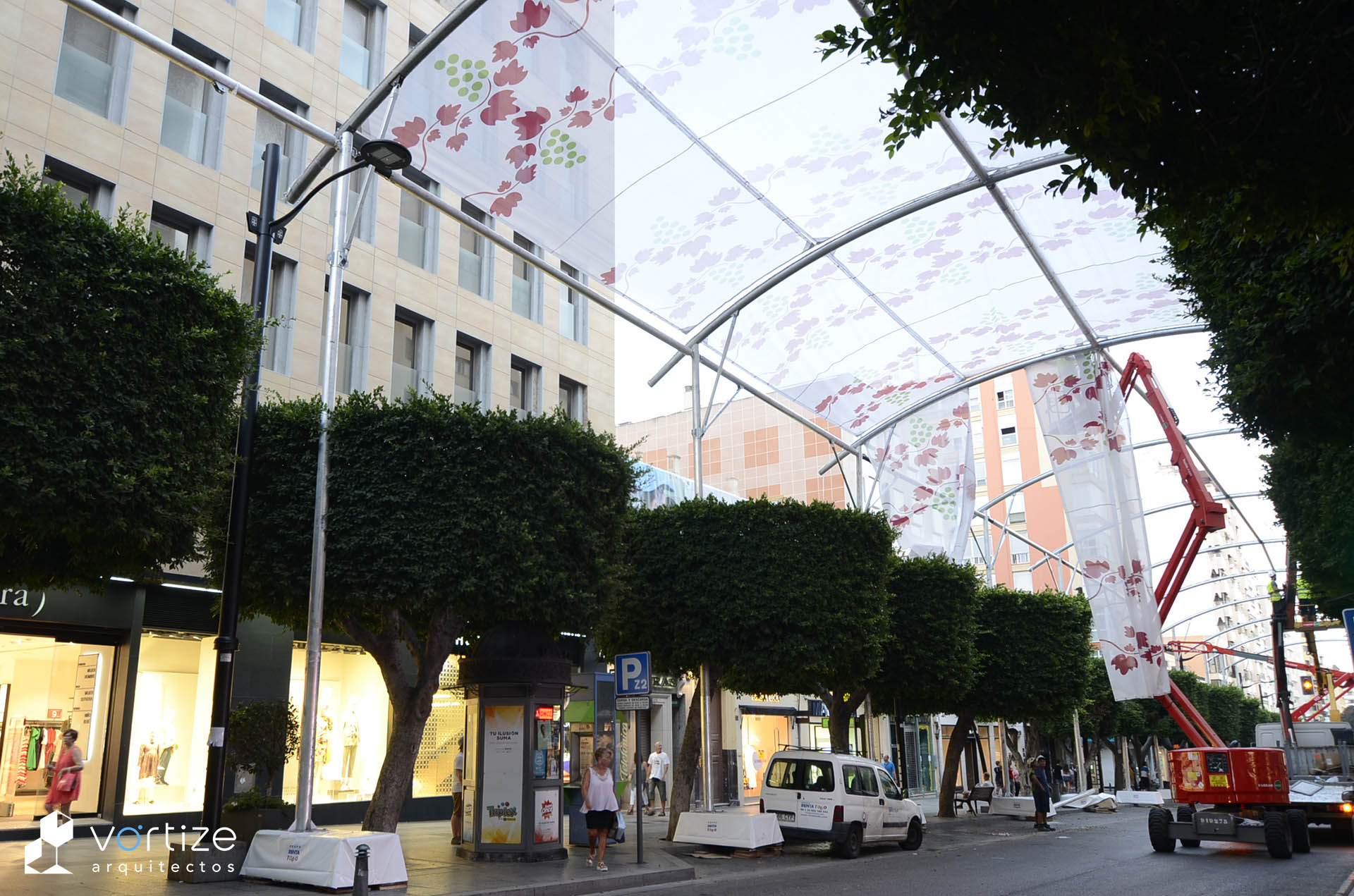 Propuesta ganadora del concurso de ideas para propuesta de entoldado autoportante del Paseo de Almería durante la celebración de la Feria y fiestas de Almería. Estructura porticada de arcos en perfil estructural circular de aluminio, arriostramiento mediante cables y lastres superficiales en hormigón. Toldos textiles translúcidos dispuestos en semicúpula.