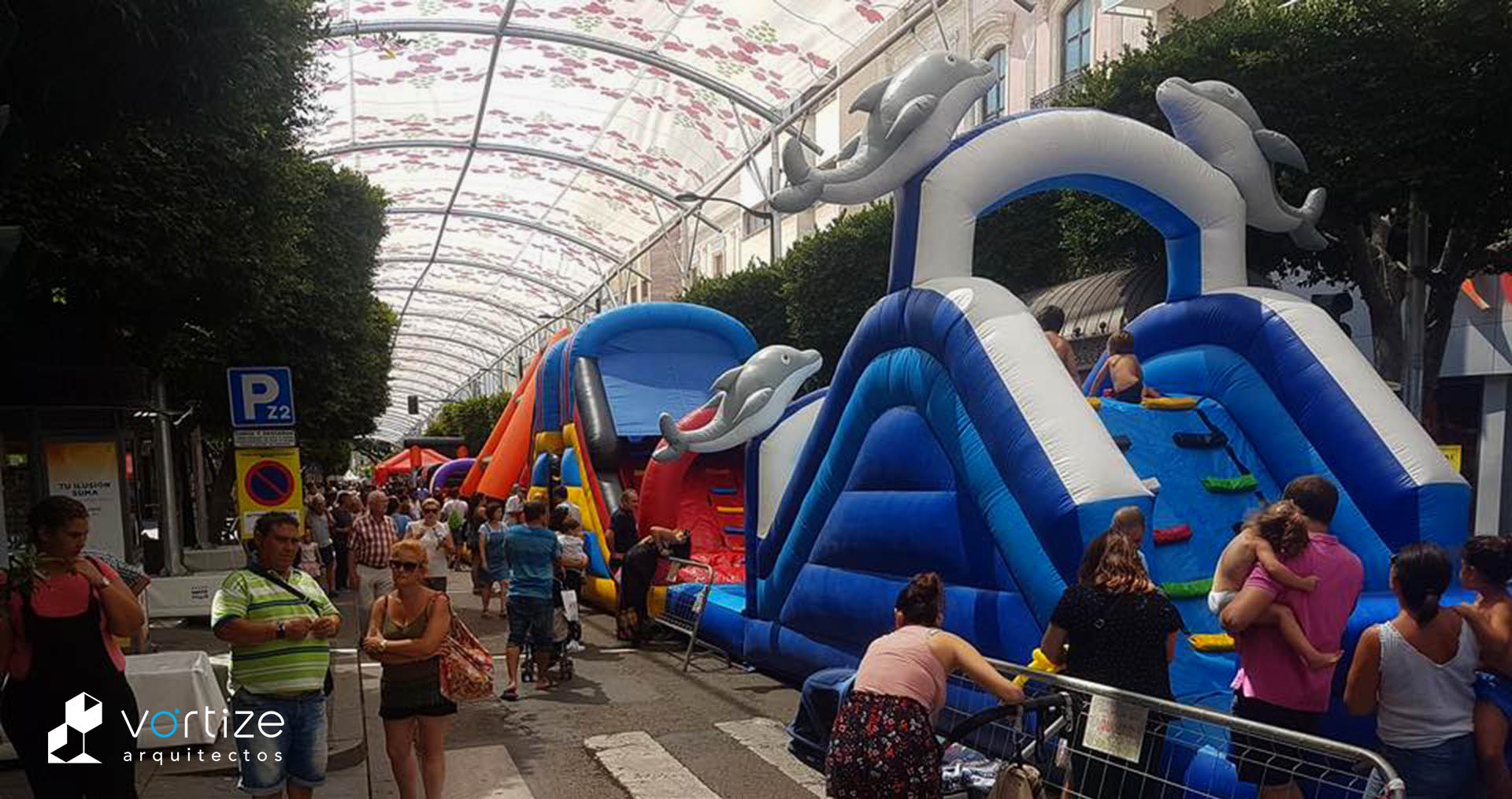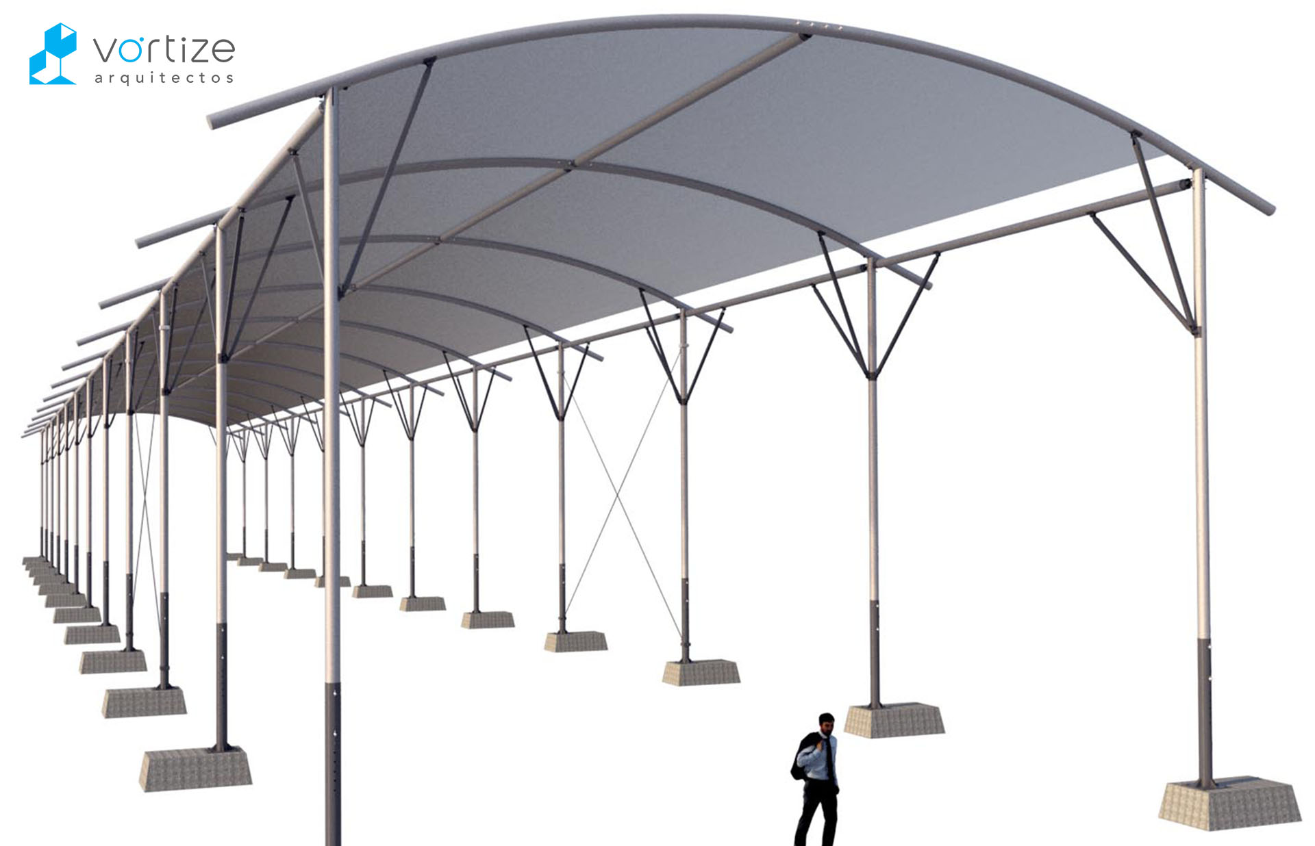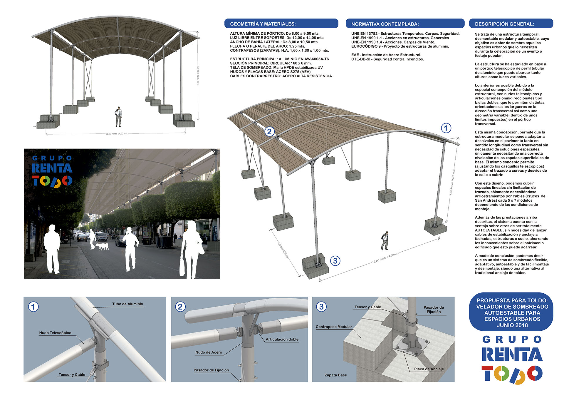 Propuesta ganadora del concurso de ideas para propuesta de entoldado autoportante del Paseo de Almería durante la celebración de la Feria y fiestas de Almería. Estructura porticada de arcos en perfil estructural circular de aluminio, arriostramiento mediante cables y lastres superficiales en hormigón. Toldos textiles translúcidos dispuestos en semicúpula.