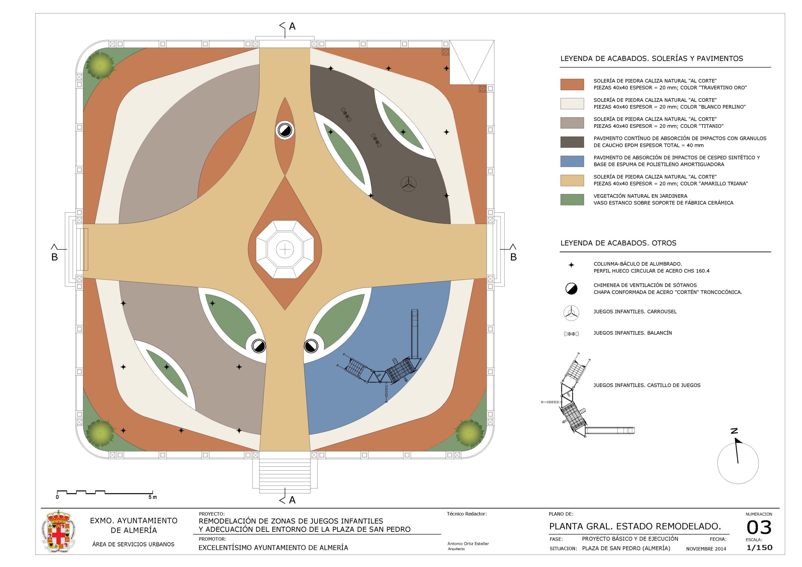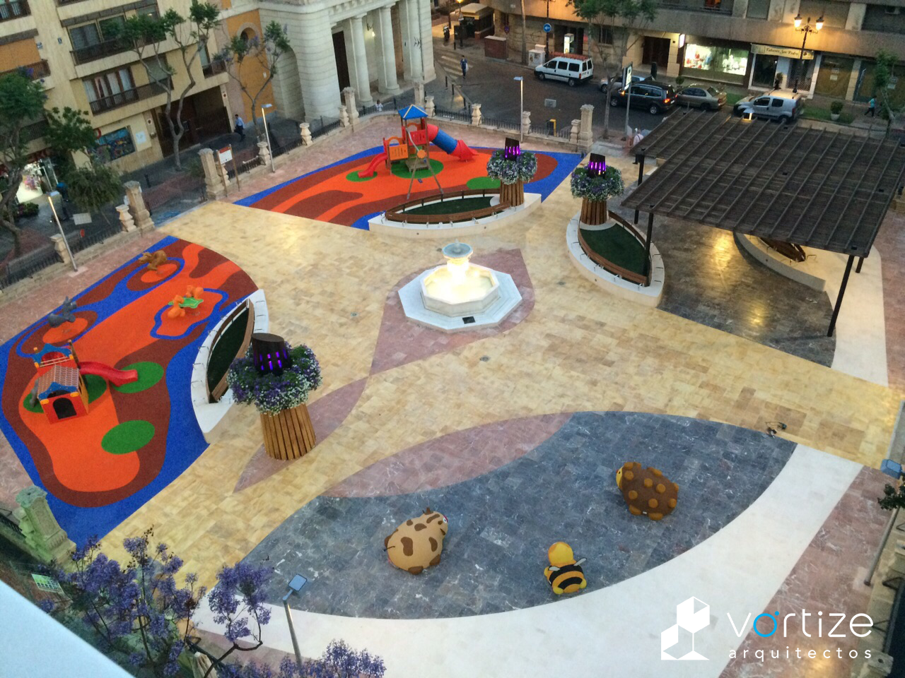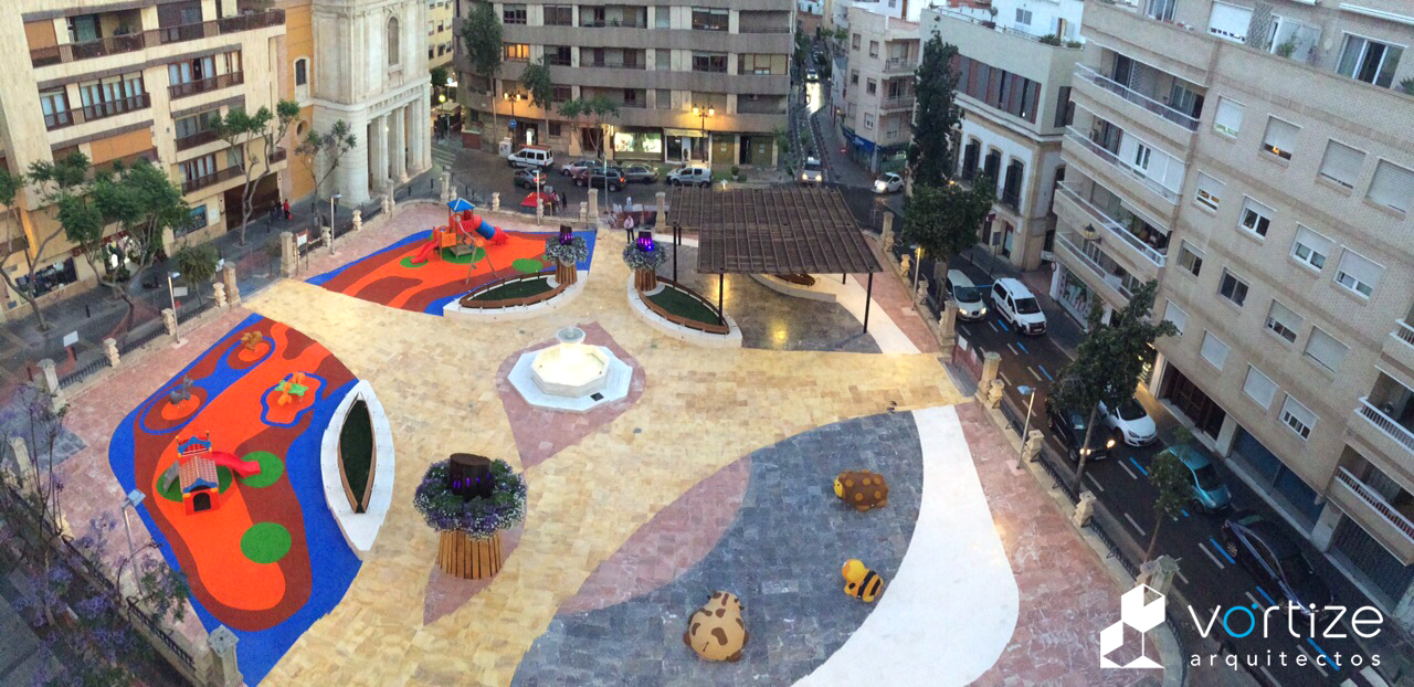 Propuesta ganadora para la reforma y adecuación de la Plaza de San Pedro. Se interviene eliminando un entorno envejecido y deteriorado para dotar la zona centro de Almería de un colorista y animado centro de reunión para las familias y los niños. Combinando nuevos materiales, elementos y formas conceptuales sinuosas, la plaza ofrece movimiento y sensaciones animadas a los usuarios.