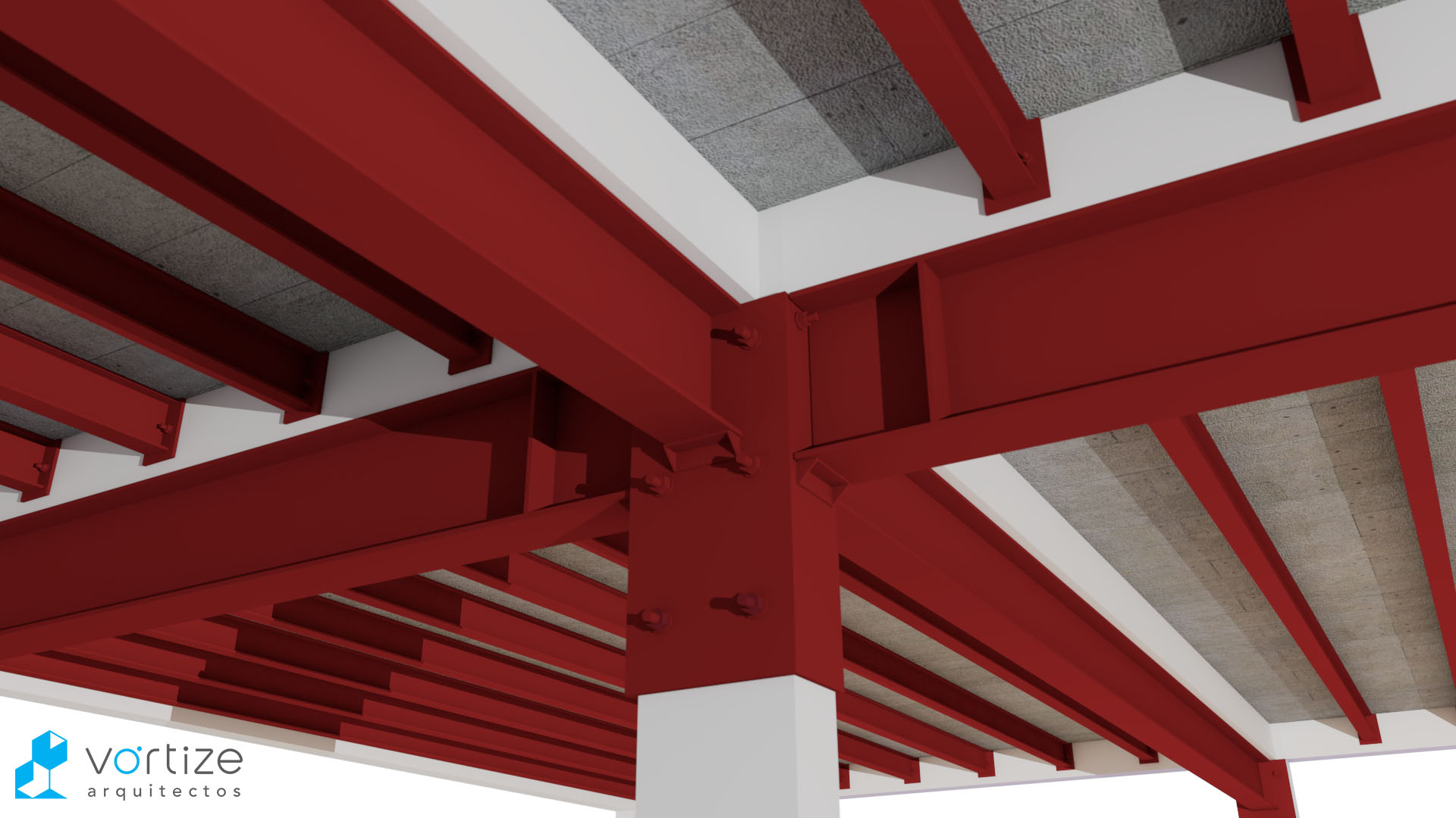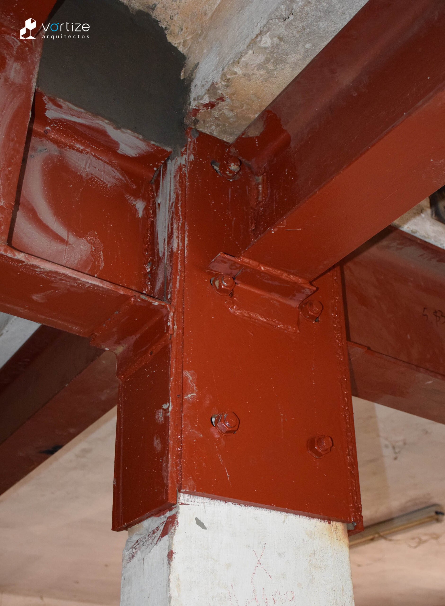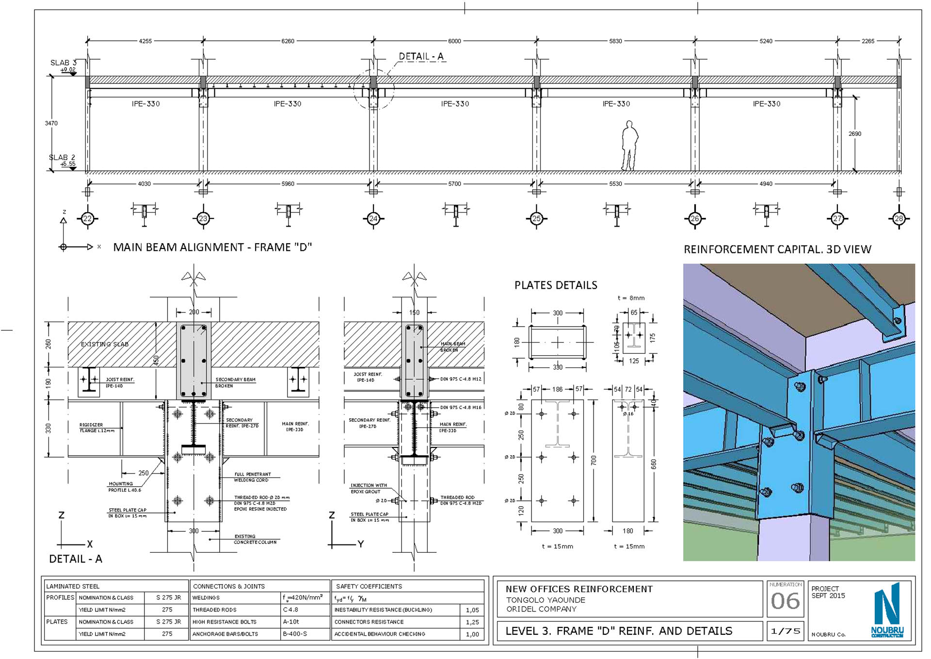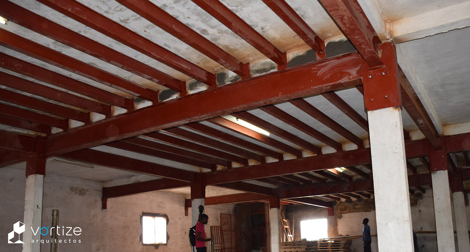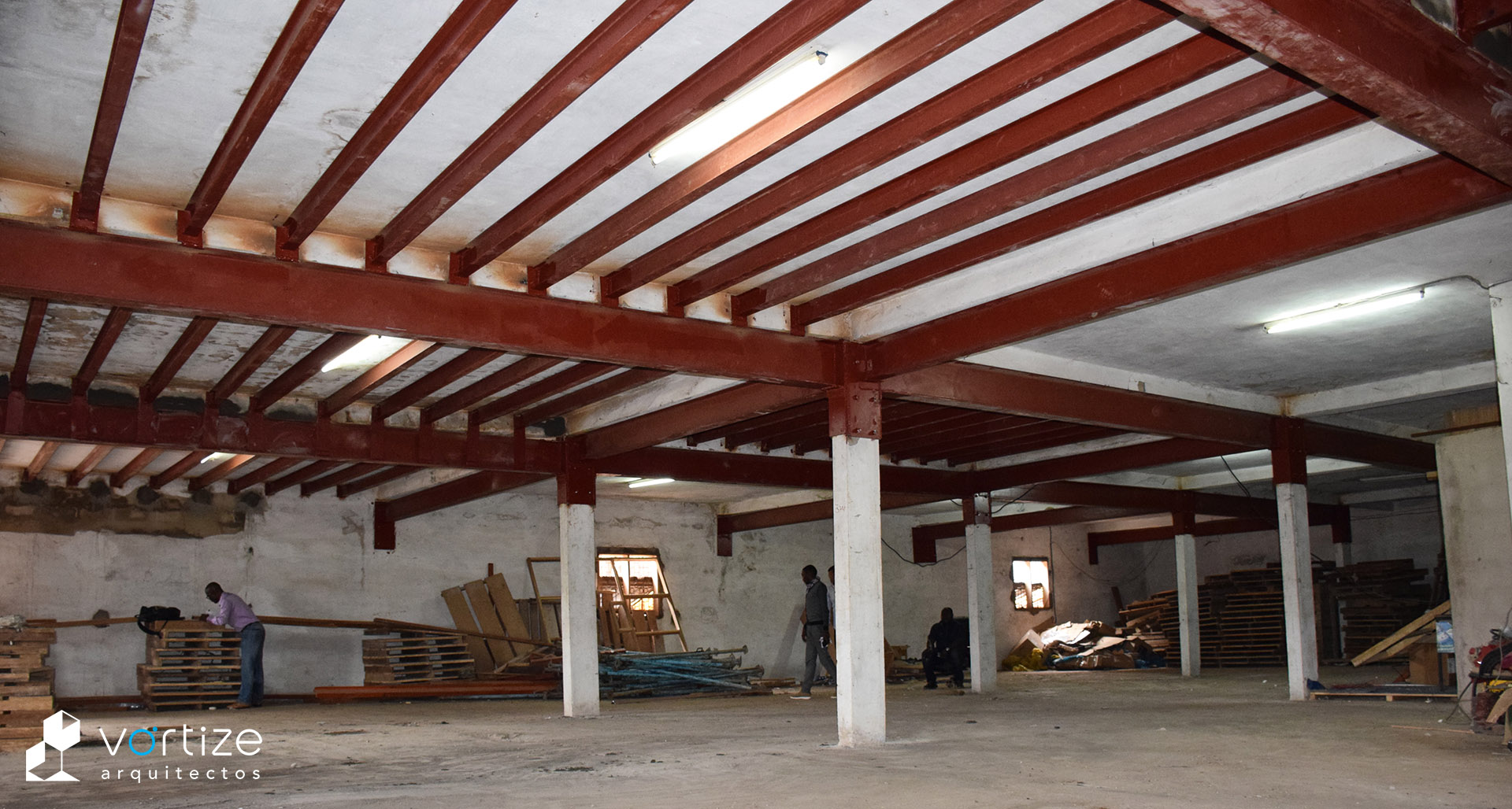 Rehabilitación y refuerzo de estructura porticada de forjados y vigas dañada en edificación industrial de almacenaje en la ciudad de Yaoundé (Camerún). Se realizó un encapsulado de cabezas de soportes de hormigón mediante collarines metálicos de conexión entregados con varillas roscadas de anclaje y la disposición de un nuevo entramado de vigas y viguetas soldadas con perfil de acero laminado.