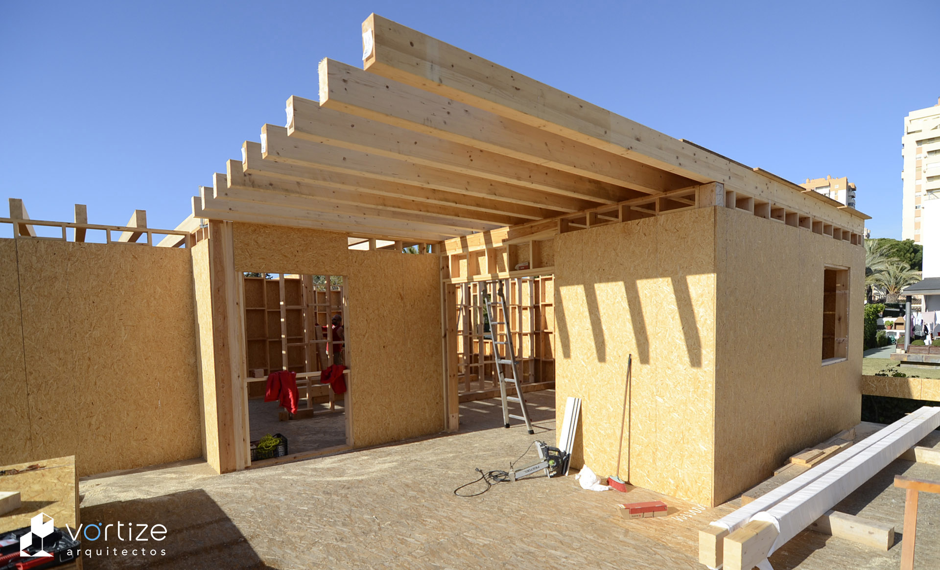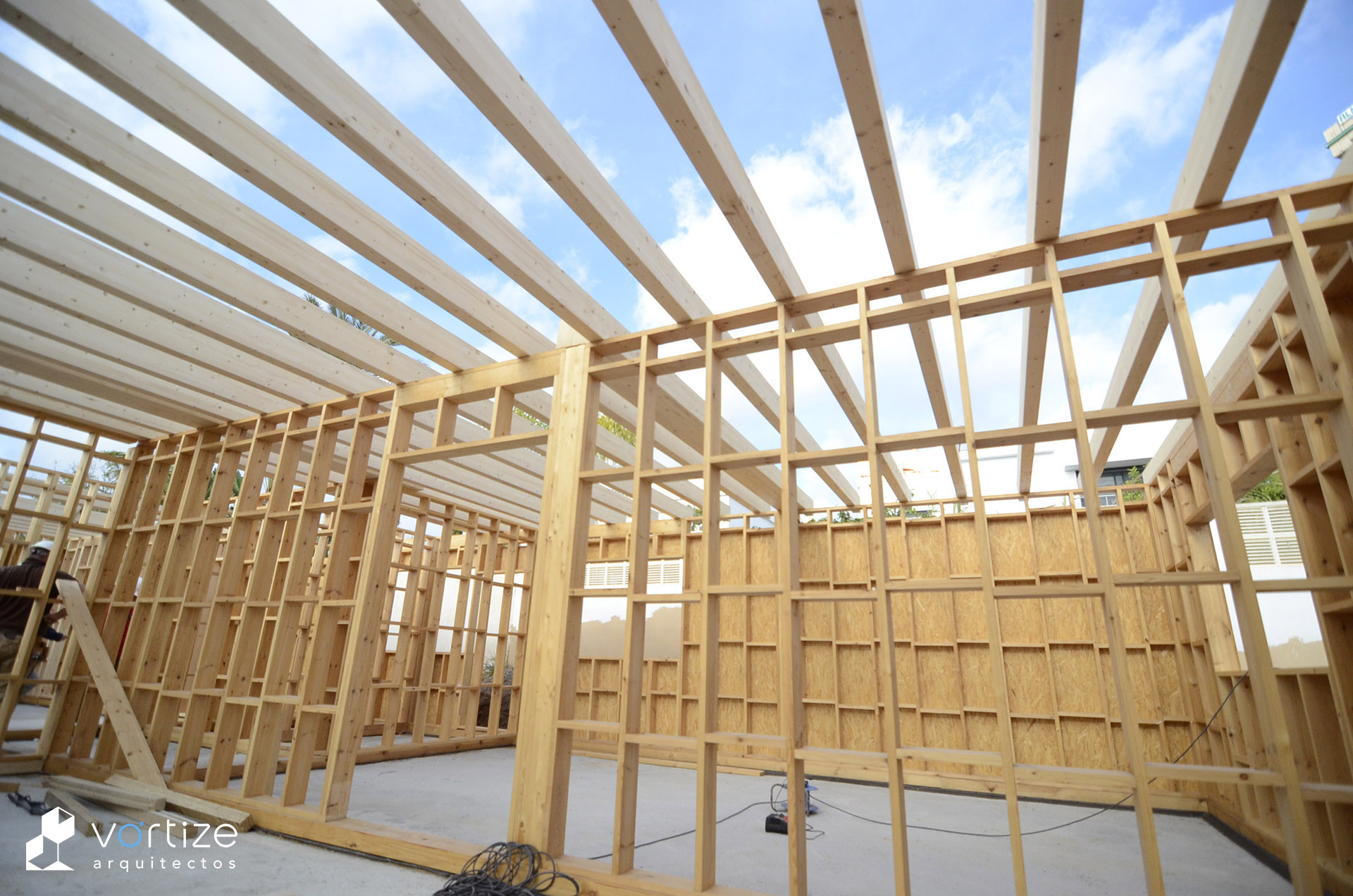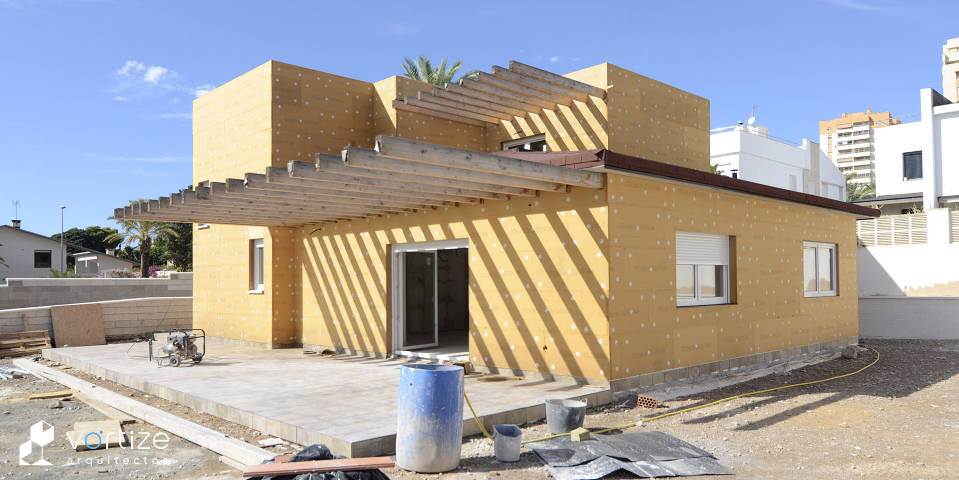 Vivienda Unifamiliar Biopasiva; construida en entramado ligero de madera «Platform Frame» y envolvente de alta eficiencia energética mediante revestimiento exterior SATE de virutas de madera estabilizadas.