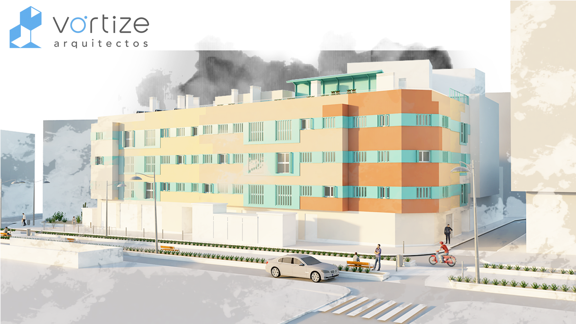 La tectónica de las fachadas se resuelve con materiales composite y chapados pétreos en colores pastel difuminados, a la vez que se usan texturas de chapas y alambres trfilados en el cerramiento de la galería posterior, que se prolonga hasta la cubierta confomando marquesinas de sombra.