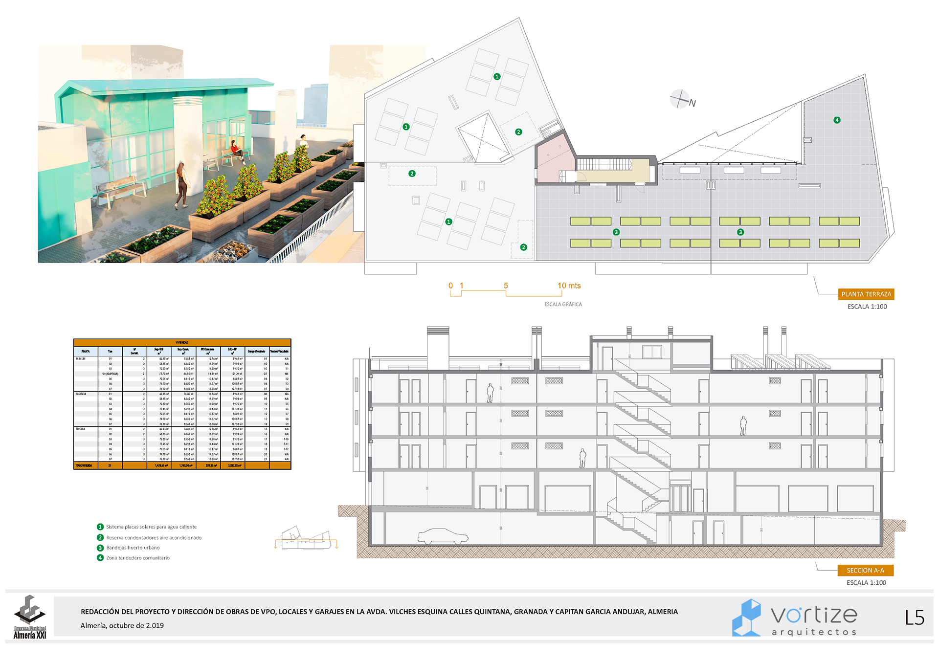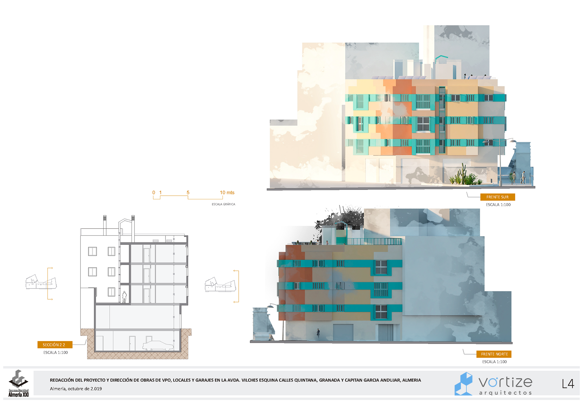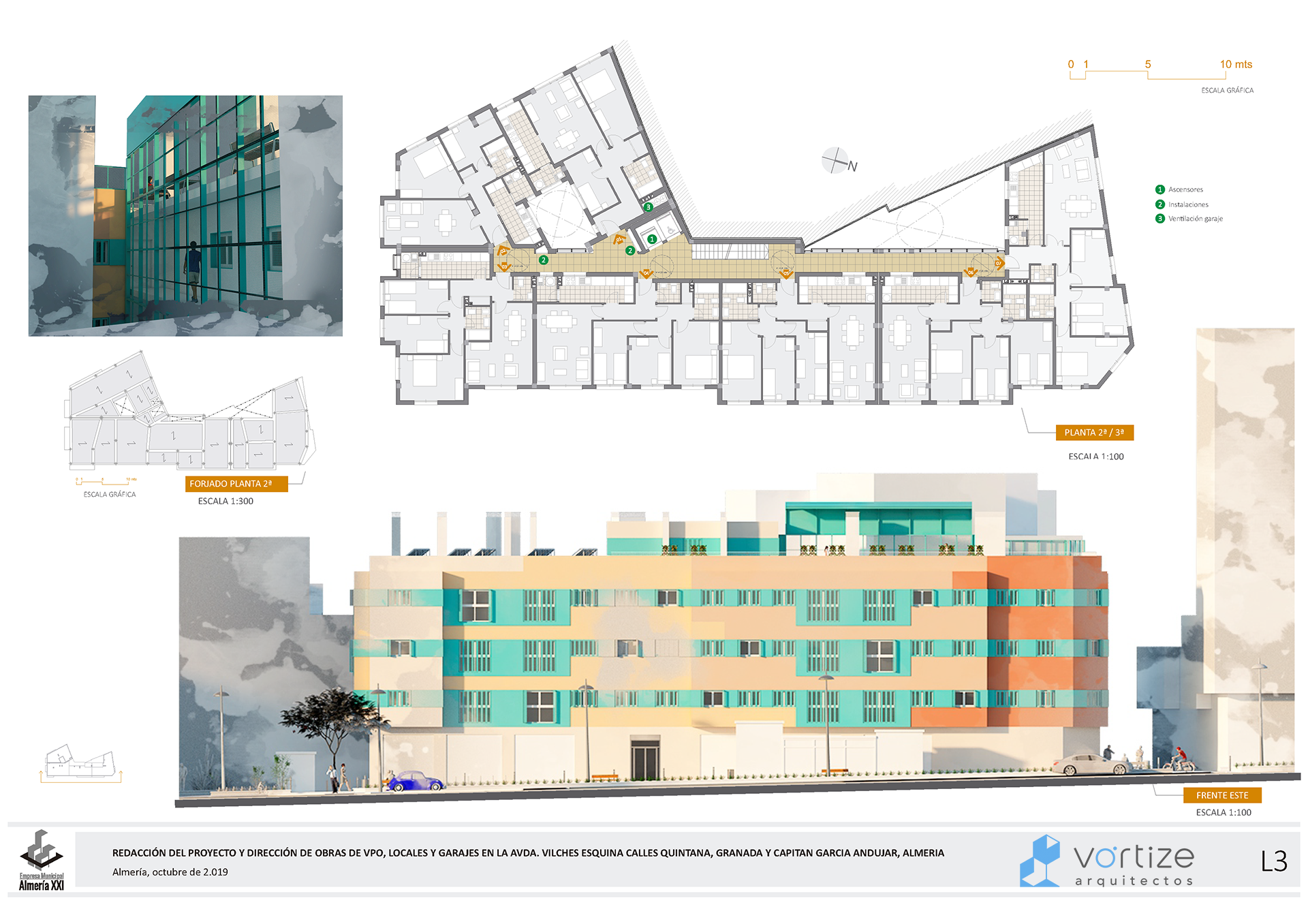 La propuesta ofrece una alternativa de diseño y distribuciones generales respetando los parámetros establecidos de VPO y programa de necesidades. Las viviendas se abren al trazado de la Avenida Vilches, accediéndose a ella a través de una galería trasera articulada con un patio.
