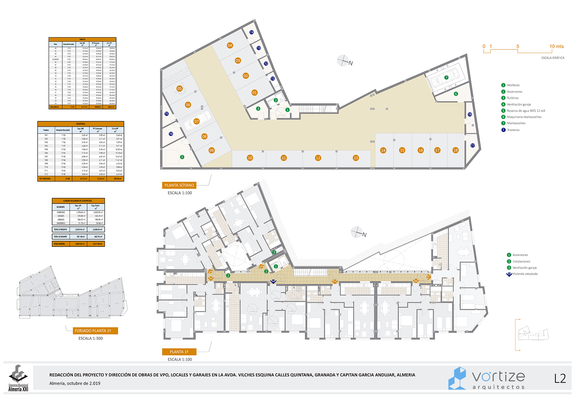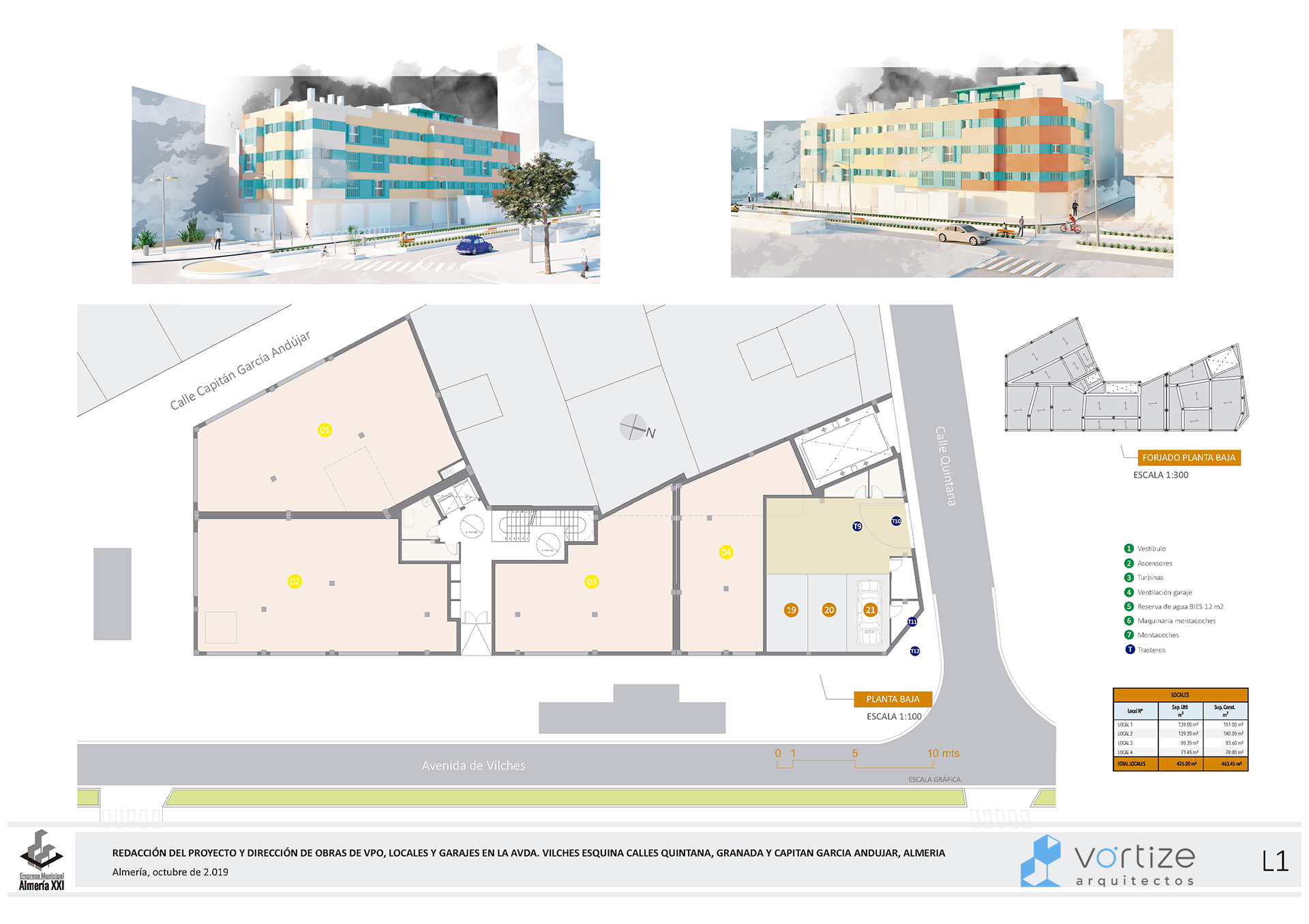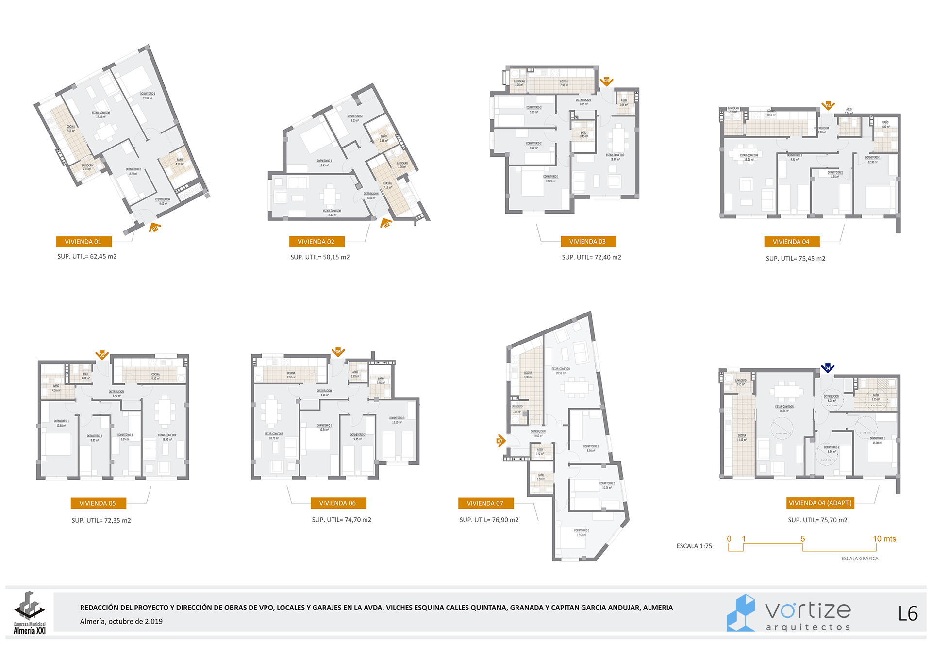 La propuesta ofrece una alternativa de diseño y distribuciones generales respetando los parámetros establecidos de VPO y programa de necesidades. Las viviendas se abren al trazado de la Avenida Vilches, accediéndose a ella a través de una galería trasera articulada con un patio.